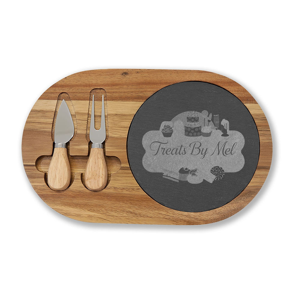 Engraved Treats By Mel Acacia Charcuterie Board with Slate Insert & Cheese Tools